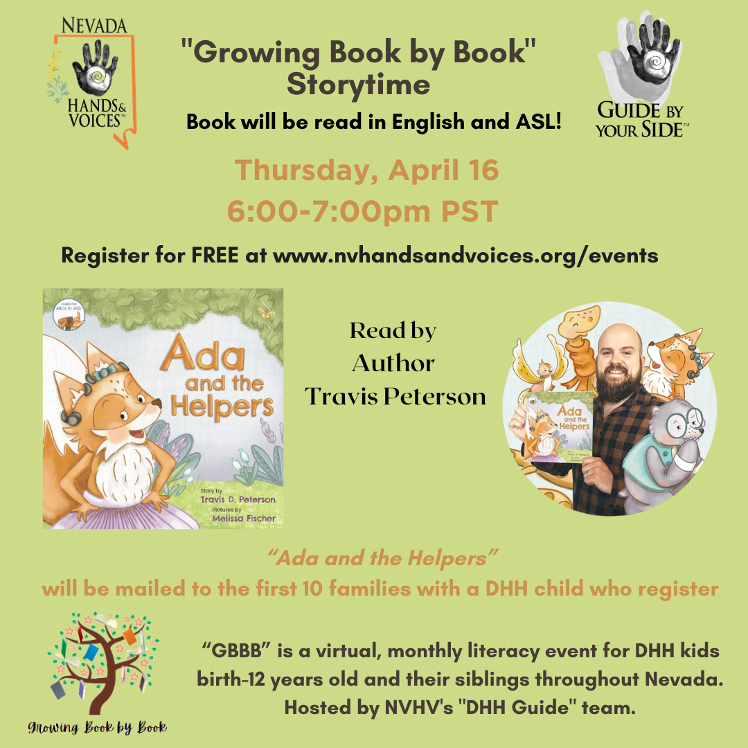 Growing Book by Book (GBBB) is a virtual, monthly literacy event for DHH children 0-12 years-old and their families throughout Nevada, hosted by the NVHV Deaf and Hard of Hearing Guide team.